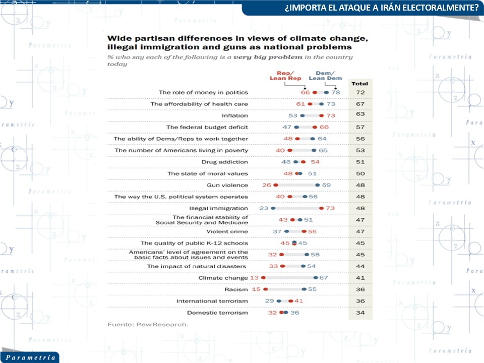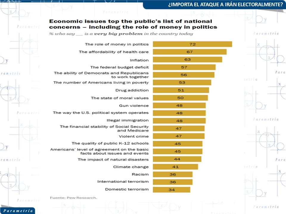 Las encuestas recientes indican que la opinión pública sobre el conflicto con Irán está profundamente dividida entre partidos políticos. Mientras que la mayoría de los republicanos apoya la acción militar, la mayoría de los demócratas y muchos independientes se oponen a ella. Debido a esta polarización, el tema tiene un impacto limitado en el cambio de preferencias electorales, ya que la mayoría de los votantes ya tiene posiciones alineadas con su partido.