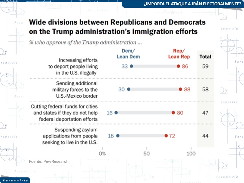 En el caso de Trump, la aprobación está fuertemente asociada con la identidad política: la mayoría de los republicanos aprueba su gestión, mientras que la mayoría de los demócratas la desaprueba. Por lo tanto, el nivel general de aprobación suele depender del juicio de los votantes independientes. Además, temas específicos de política pública —como la inmigración, la seguridad fronteriza y el control del crimen— también influyen en la evaluación del presidente.