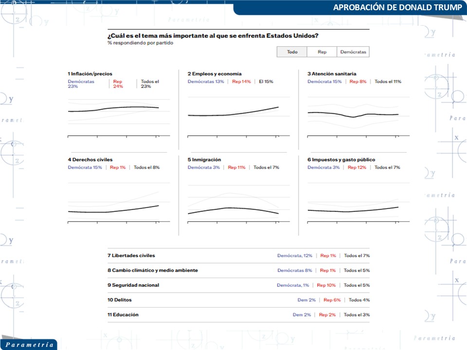Los empleos y la economía en general pasan a ser el segundo tema en importancia. Estos representan el 15 por ciento de las preocupaciones. Es decir, los temas relacionados con precios o economía en general suman casi el 40% de las preocupaciones de los estadounidenses.