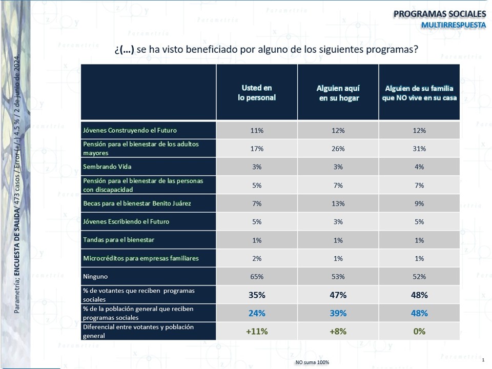 De acuerdo a la encuesta de salida de Parametría realizada el día de la pasada elección presidencial hay algunas conclusiones evidentes. Los datos muestran una clara influencia de los programas sociales en la preferencia electoral: entre beneficiarios personales 74% vota por Morena-Verde-PT, frente al 52% de los no beneficiarios. Esto es una diferencia de +22 puntos. En hogares beneficiarios 69% vota por Morena-Verde-PT, frente al 51% en hogares no beneficiarios (+18 puntos).Las familias extendidas beneficiarias, 67% vota por Morena-Verde-PT, frente al 53% en las que no reciben (+14 puntos). En resumen, los beneficiarios directos o indirectos de programas sociales tienen una mayor inclinación hacia Morena-Verde-PT que los no beneficiarios, lo que sugiere que sí existe una relación entre recibir apoyos y la preferencia electoral.