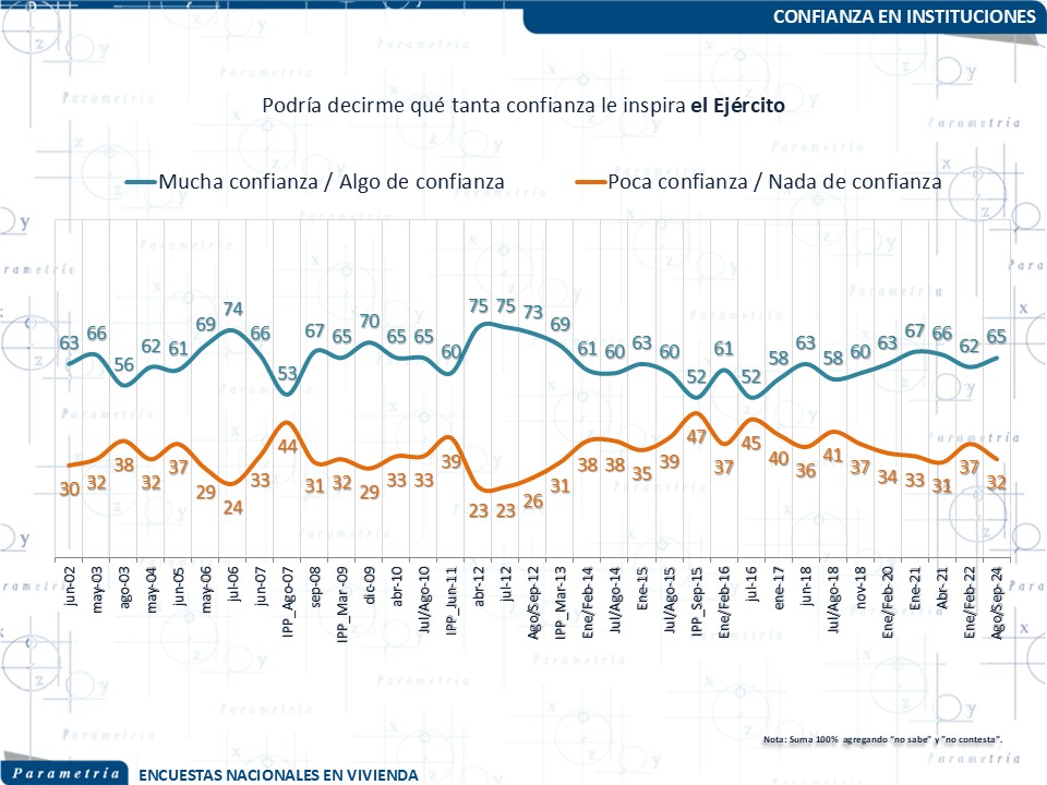 De acuerdo con los datos de Parametría, el punto más alto se registra en julio/agosto de 2014, con un 77 % de confianza, mientras que el nivel más bajo se observa en septiembre de 2015, cuando la cifra desciende a 48%. Esta caída abrupta puede interpretarse a la luz de los acontecimientos de la época, como los cuestionamientos al papel de las fuerzas armadas en operativos de seguridad y las denuncias de violaciones a derechos humanos. Es posible que la opinión pública reaccionara de forma crítica a esos episodios, lo que se reflejó en una disminución significativa de la confianza.