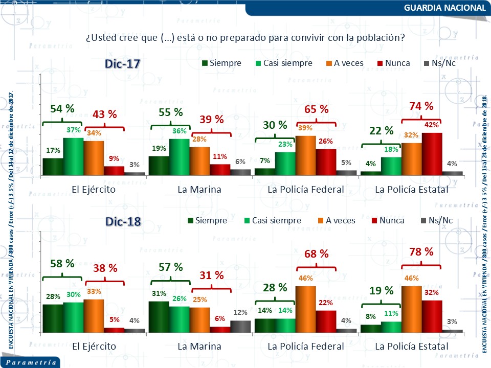 A pesar de los cambios de administración federal y de la creación de nuevas instituciones como la Guardia Nacional, la Marina no ha sufrido descensos bruscos en su nivel de confianza. Esto puede explicarse por su papel complementario en el diseño de la estrategia de seguridad, así como por la percepción de que sus operaciones están más profesionalizadas en comparación con otras fuerzas. La Marina también ha ampliado sus funciones en tareas de seguridad interior y de apoyo a la Guardia Nacional, lo que refuerza su visibilidad pública.
