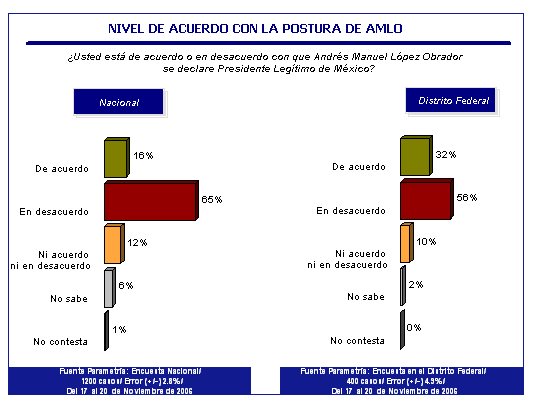 NOTA METODOLÓGICA.Estudio: Encuestas en vivienda. Representatividad: Nacional y Distrito Federal. Número de entrevistas: 1,200 nacional y 400 en DF. Nivel de confianza estadística: 95%. Margen de error (+/-) 2.8% nacional y (+/-) 4.9% DF. Diseño, muestreo y análisis: Parametría SA de CV. Operativo de Campo: Grupo Viesca. Método de muestreo: Aleatorio sistemático con probabilidad proporcional al tamaño. Unidad de muestreo: Las secciones electorales reportadas por el IFE. Fecha de levantamiento: del 17 al 20 de noviembre del 2006.