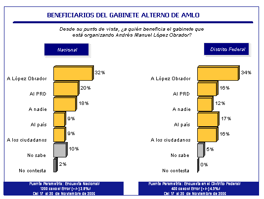 Por ejemplo: para la opinión pública nacional los principales beneficiarios del gabinete alterno organizado por Andrés Manuel López Obrador son el propio presidente legítimo (32%) y el Partido de la Revolución Democrática (20%). Un 18% considera que nadie se verá beneficiado y sólo uno de cada diez piensa que el país o los ciudadanos saldrán favorecidos.