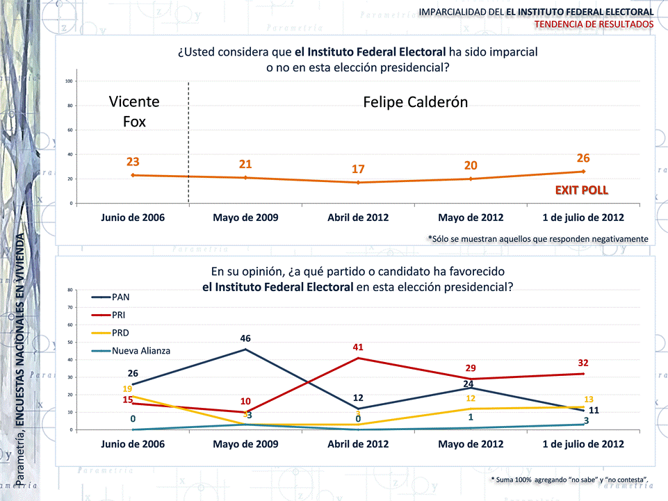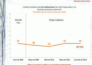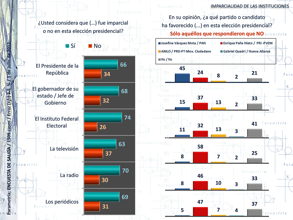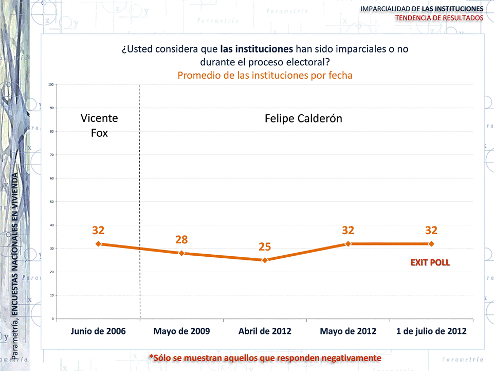 Durante las elecciones de 2006, 2009, y 2012, Parametría ha dado seguimiento a la percepción que los ciudadanos tienen de las instituciones mexicanas respecto a su conducción en las contiendas. Desde las elecciones de 2006 hasta las contiendas de 2012, una tercera parte de los mexicanos desconfía de la imparcialidad de las instituciones en general. Ésta constancia se observa en 2006 y 2012, años en los que se votó para elegir Presidente de la República.