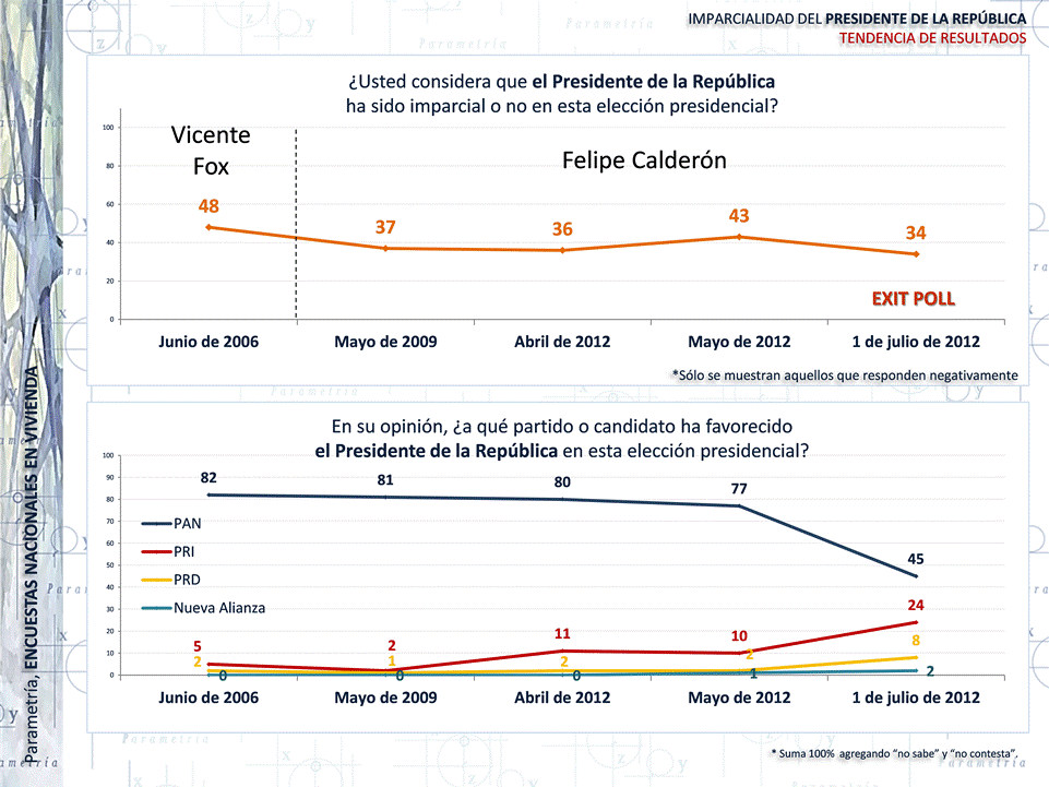 Sin embargo, en mayo del año en curso, la institución presidencial volvió a ser juzgada de ser parcial. Cuatro de cada diez encuestados notó en el presidente Calderón cierta preferencia por Josefina Vázquez Mota, candidata del PAN. Este favoritismo disminuyó considerablemente para el 1 de julio. Es posible que ésta percepción se explique en parte a la caída de la candidata panista en las preferencias.