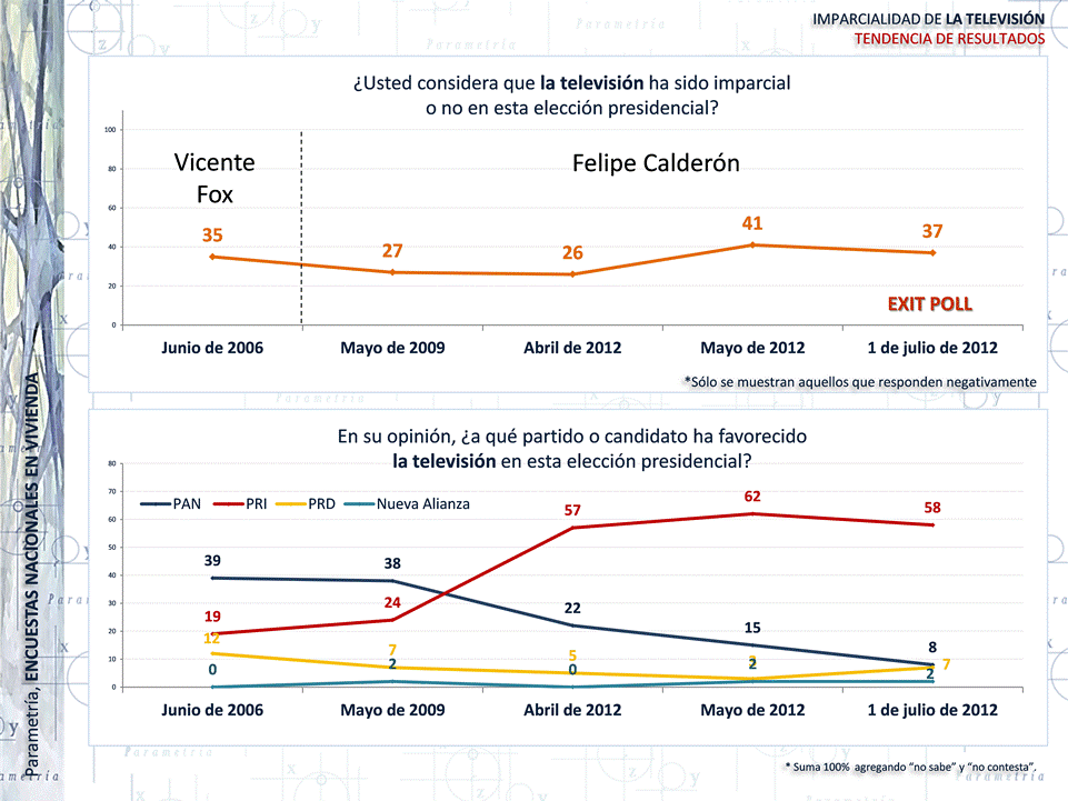 En la contienda electoral del 2012, la televisión -dentro de los medios de comunicación- ha sido la más tendenciosa en opinión de la gente. El 37% de los votantes no considera a la televisión un medio imparcial. La ciudadanía opina que el medio televisivo ha favorecido a Enrique Peña Nieto. En abril del presente año este dato fue de 57%, para mayo la apreciación de una preferencia abierta por el candidato priista subió a un 62%, y para el día de la elección se ubicó en 58%.